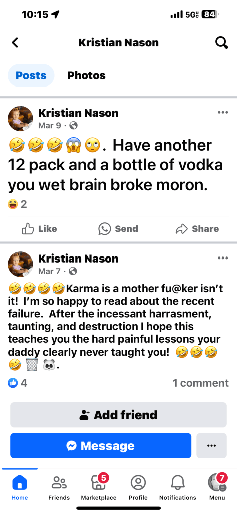 I have an ongoing PO with him. He’s violated it. He was charged and fined, which I find ridiculous, but just this last Christmas Eve he was sending me a friend request on Facebook. Then continued to remove and resend the request for about a month. He’ll stalk my social media, see my posts, then post angry responses to his page. Why???!!!!! Pics below. The last is a unsolicited response to after having hip replacement surgery a year ago, my hip was trying to come out of the socket. I thought it failed. I posted about it on social media. Oh, and he continually accuses me of being an alcoholic. And yet the friend requests. Make it make sense.